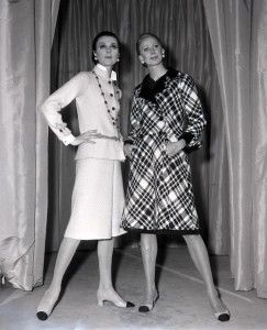 26 Jun Paris, France, 21st July 1970, Models display a beige tweed skirt suit (left) and plaid grey coat (right) by French designer Coco Chanel being modelled in Paris